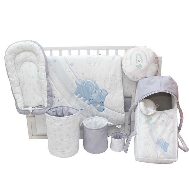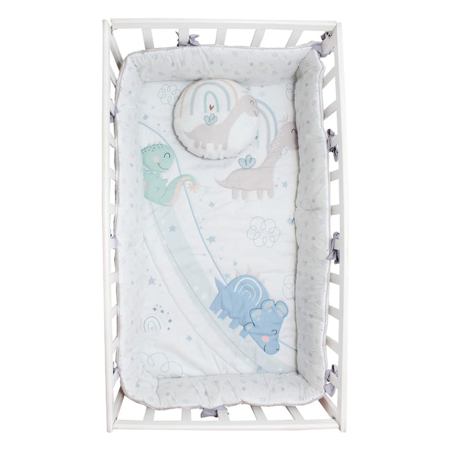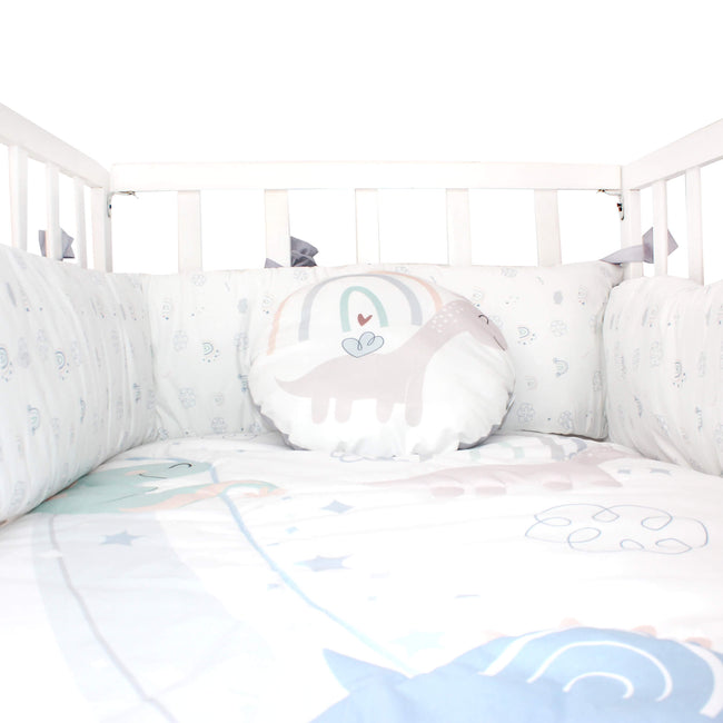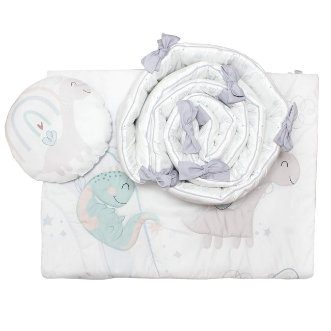 Transforma el espacio de tu bebé con un diseño abstracto de dinosaurios y colores suaves que crean armonía y estilo. El set incluye edredón, bumper completo, sábana de cajón y cojín en forma de hoja. Hecho con microfibra tacto algodón y algodón poliéster para suavidad y frescura. Combínalo con bambineto, nido y cestos organizadores para completar su mundo prehistórico con encanto.