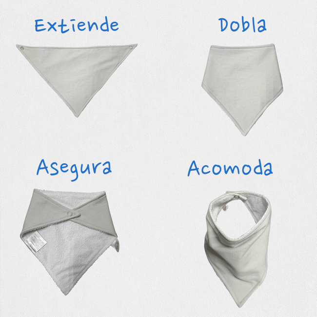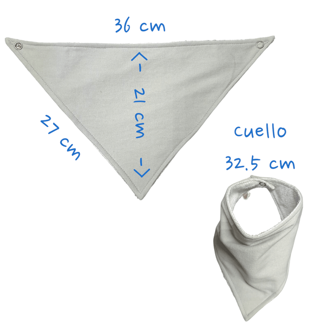 Incluye: 3 Piezas de babero estilo bandana medida 20 cm alto x 35 cm Largo 32. 5 cm de circunferencia para cuello. Tela Microfibra 100% Poliester al frente, interior Tela tipo afelpado impermeable 100% Poliéster y reverso afelpado microfibra 100% Poliéster. Broche niquelado para sujeción en cuello.